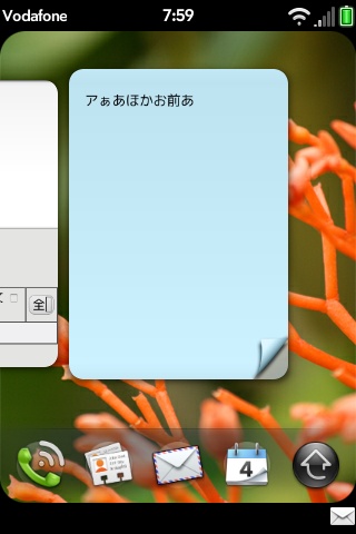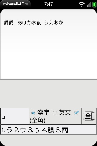 中国のサイトにあったPalm Pre用中国語入力アプリの辞書を改造して、なんちゃって日本語IMEを作ってみました。辞書サイズは500kb程度、テストでところどころに単語を書き加えてPreに書き戻しています。文節変換とか、学習とかそんな高度な処理は一切無視ですのであしからず。