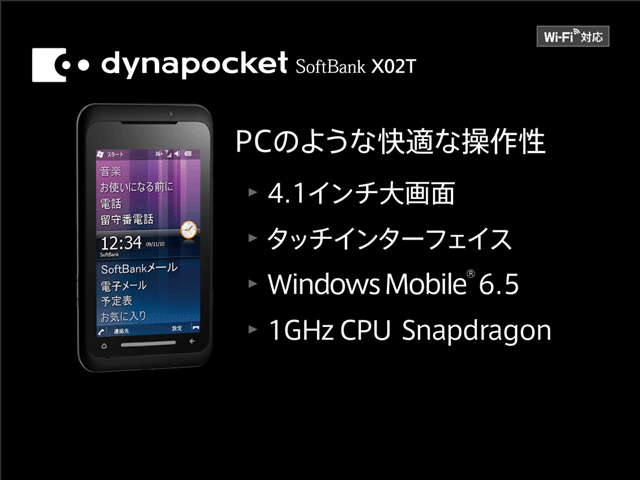 続いて、東芝dynapocketのX02T。docomoのT-01Aとハード的には同じように見えます。こちらは、最初からWM6.5を搭載してますね。今までの傾向から、3G、WiFi、BT、USBホストは同時使用可能だと思います。防水あるなら宣伝してるでしょうから、防水ではなさそうですね。色は、マットブラックのみ。