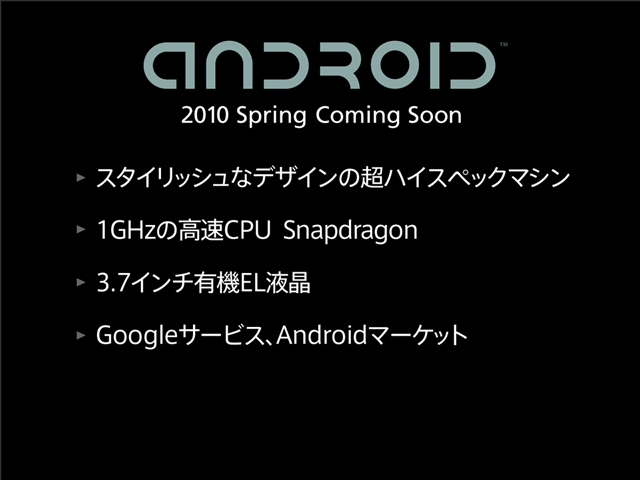 そして、android搭載機の予告。CPUに1GHzのSnapdragon。3.7インチ有機EL液晶。ソニエリのX10は4インチ液晶なので違いますね。どんなデバイスか楽しみです。
