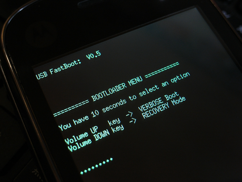 PCとUSBケーブルを接続したままだと、すぐにCLIQが再起動してしまうので、USBケーブルを抜いて、CLIQの電源をOFFにします。カメラボタンを押しながら、電源を入れると、BOOTLOADERメニューになるので、10秒以内にVolume Downキーを押します。