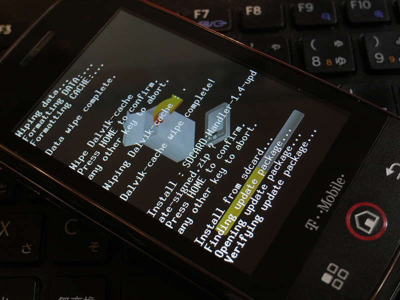無事、リカバリーメニューに入ると、Nexus Oneでも見慣れた画面に。これでROM焼きが可能になたので、さっそくHandler 1.4のROMをダウンロードして、焼いてみました。