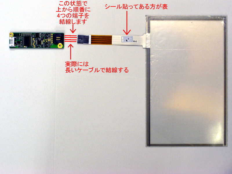 タッチパネルと制御板の配線。フレキに製造年月のシールが貼ってある方が表側。こんな感じで、素直に対の端子同士を結線する。
