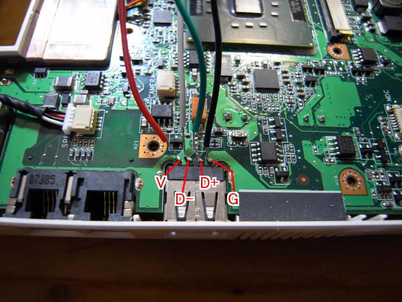 USB端子付け根に結線すると