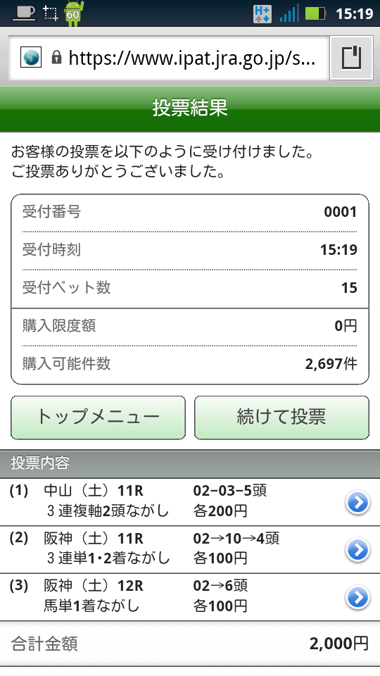 さて、ホントの買い目はこちらです。金額もかわいいものです。左は最終決定画面、右は受付完了画面ですね。