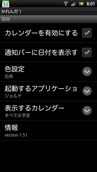 「カレンダーを有効にする」と「通知バーに日付を表示する」にチェックを入れると、通知バーの左側に日付と曜日をコンパクトに表示。「色設定」では、通知領域に表示される月間カレンダーの背景色が白系か黒系のどちらかで選べます。「起動するアプリケーション」では、月間カレンダーをタッチした時に起動するアプリを選択できます。「表示するカレンダー」では、Googleカレンダーの中から必要なものを選択できます。ちなみに Galaxy NEXUSでは「色設定」という項目がありませんでしたが、これは背景が黒系と決まっているからでしょうかね。