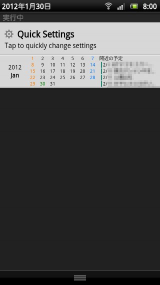 通知領域に月間カレンダーと直近4つの予定が表示されてます。残念ながら、今のところ、繰り返し予定の表示には対応していないようですが、自分は「起動するアプリケーション」で、月間カレンダーをタッチした時に起動するアプリを「ジョルテ(Android マーケット)」というカレンダーアプリに割り当てているので、とくに気になってません。