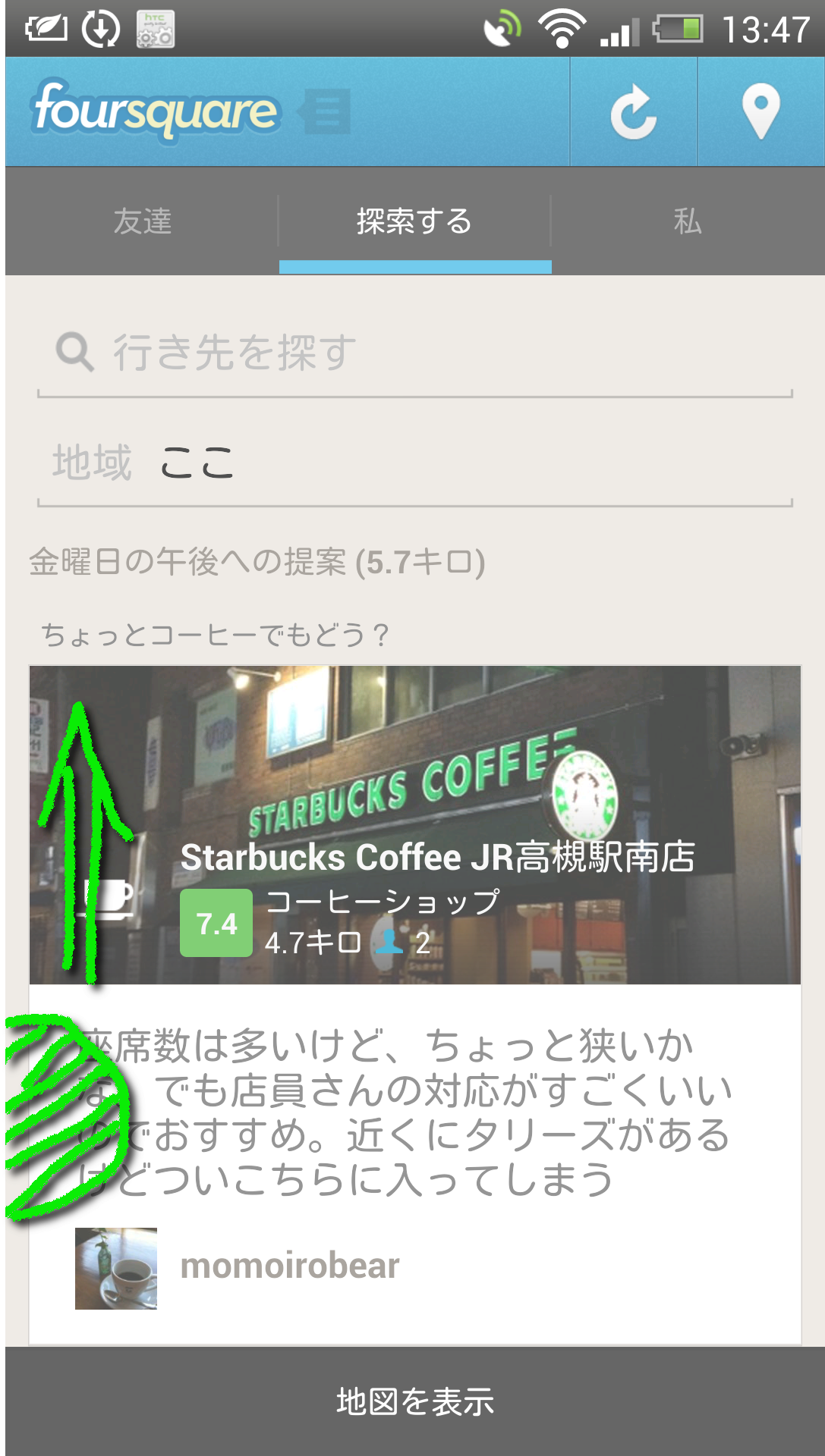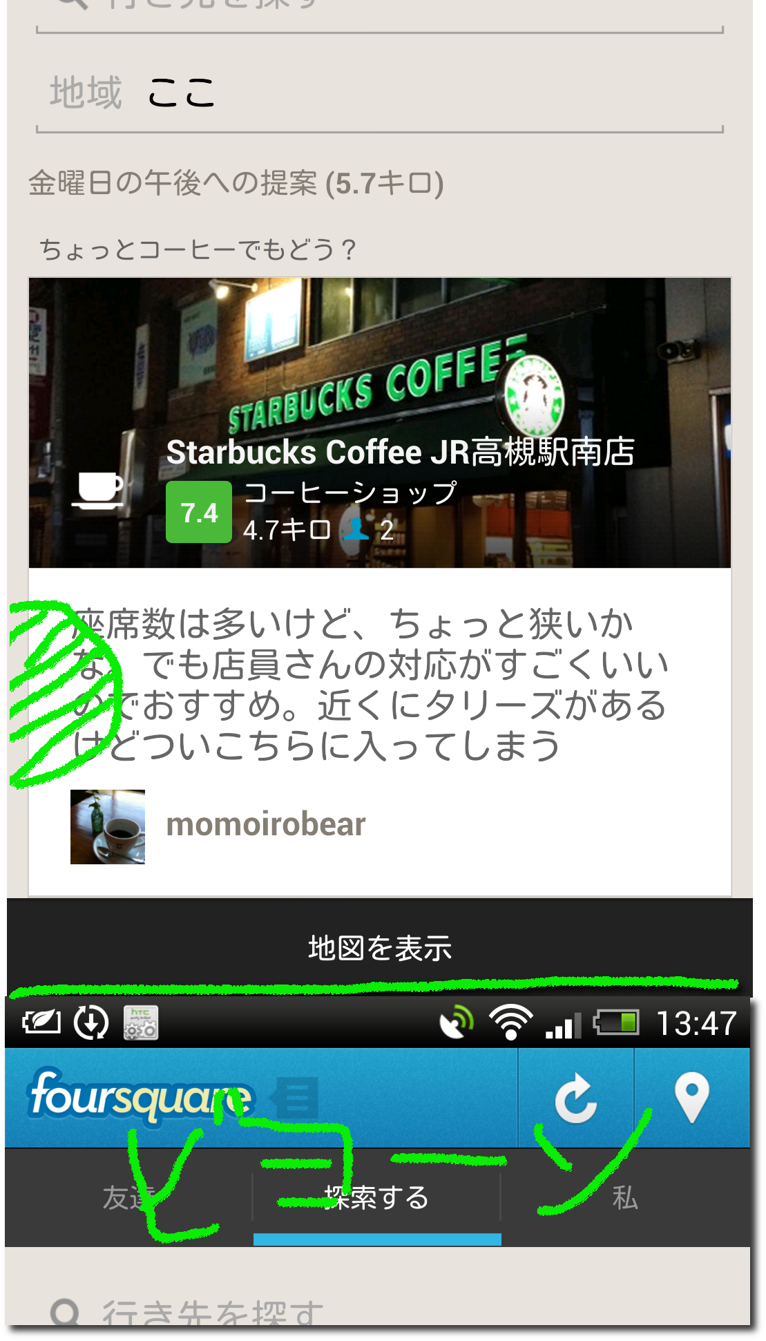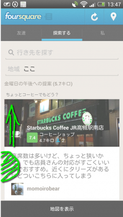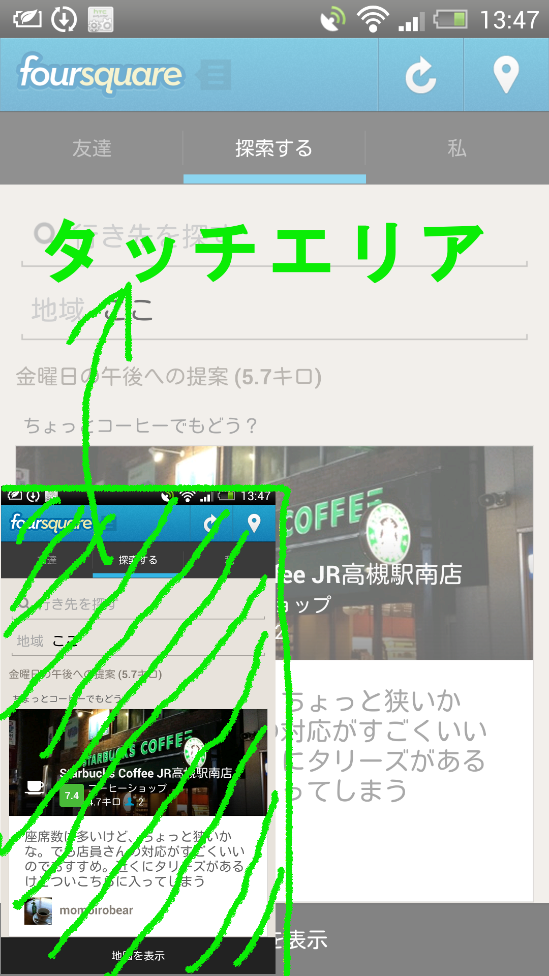 片手操作派の私には、大顔面シリーズでFoursquareを気持ち良く使う場合、親指を6.5cmほど延長する必要があるようです。ハンディー端末での6.5cmは、かなり遠いです。東名高速でどんだけ走っても静岡県を出られないとか、北陸道で新潟を走ってる気分です。一部のアプリケーションではボタン位置を選べますが、Foursquareがそんな細やかな対応をするとは思えませんよね。