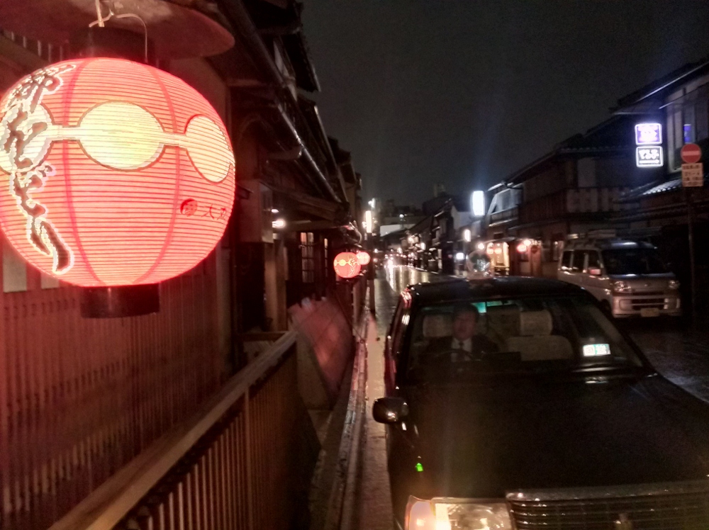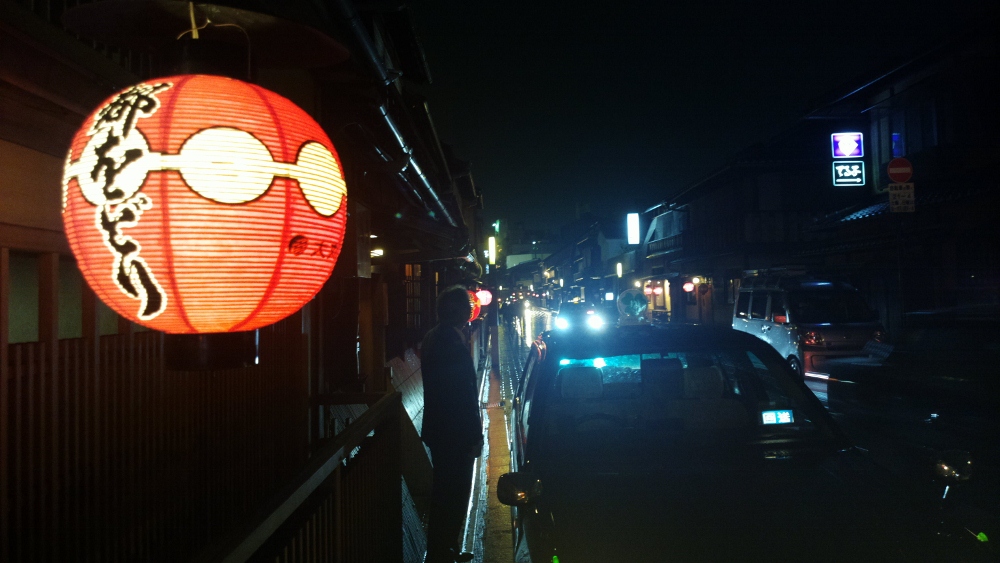 ちょっと題材として分かり難いものを選んでしまったかもしれませんので、もうちょっと祇園っぽいとこに行ってみました。雪がちらちら降っている夜11時過ぎで、観光地になってしまっている地域です。このまままっすぐ北に行くと、賑やかなんですがね。