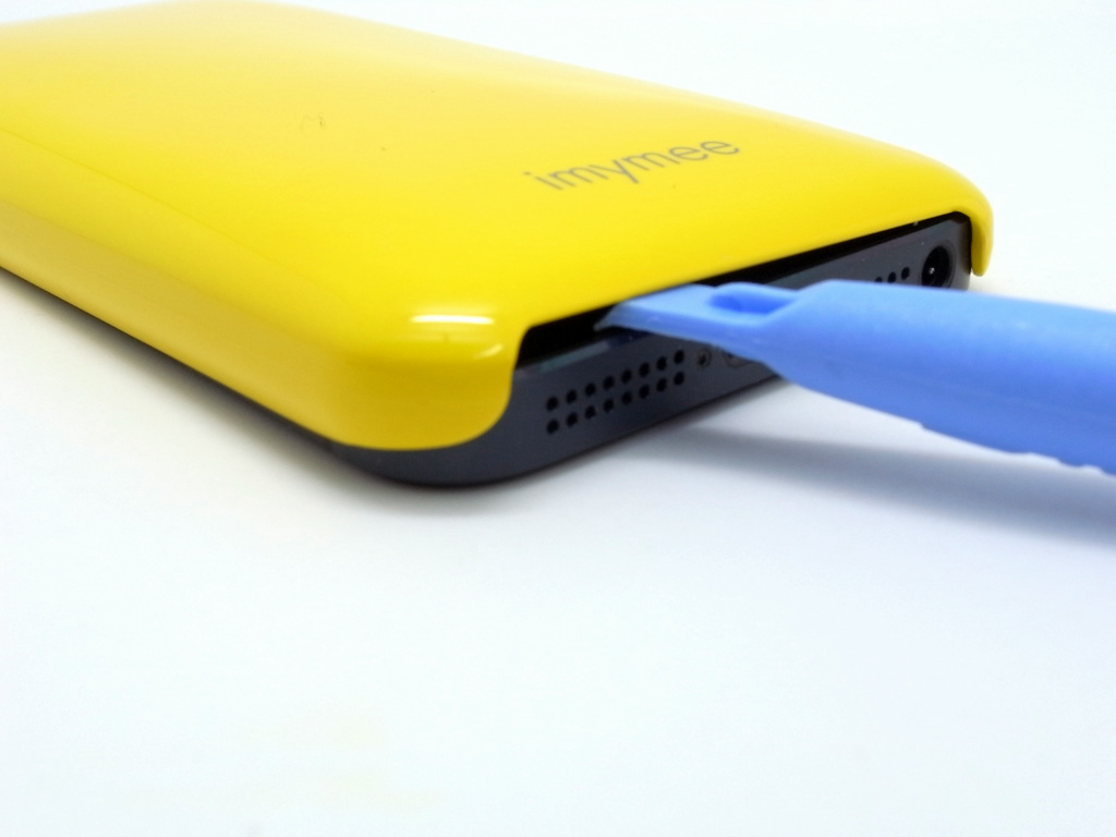 ケース本体は、ポリカーボネート素材で形成されており、非常にフィット感が高いため、ケースの取り外しには、ケースオープナーを使うことをオススメします。下記写真のように、ケース底面付近にケースオープナ−を差し込んで、少しずつ隙間を大きくしていくと、開けやすいです。