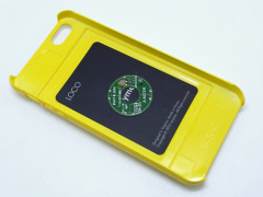 ケース背面の凹みに SUICAなどの電子マネーカードを収納して、カードの上に付属の電磁波抑制シートを被せたら、そのままケースにiPhone5をカチッとはめ込みます。これでおサイフ機能付き iPhone5 の出来上がり。