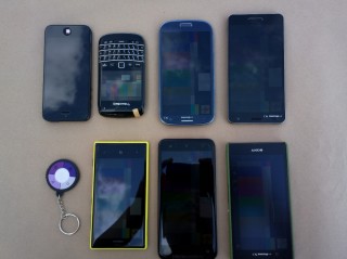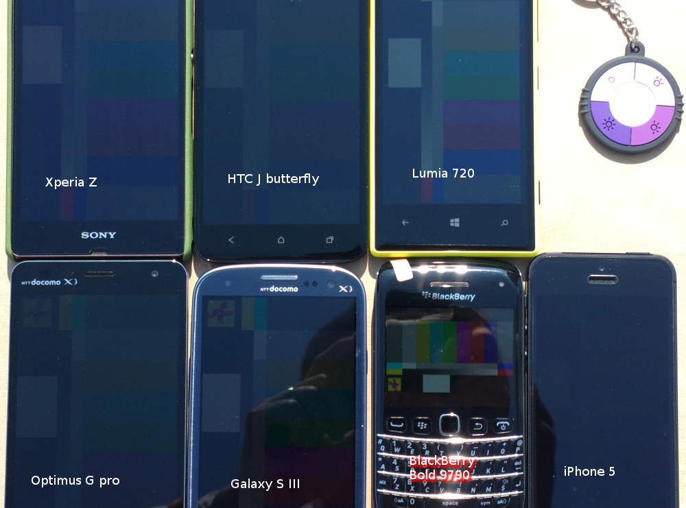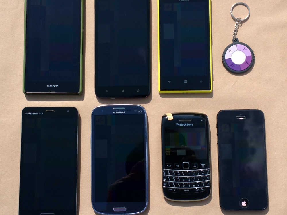 近くの駐車場にシートを敷いて並べてみました。右上から反時計周りに、UV Checker、Lumia 720、HTC J Butterfry、Xperia Z、Optimus G pro、Galaxy SIII、BlackBerry Bold 9790、iPhone 5です。