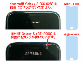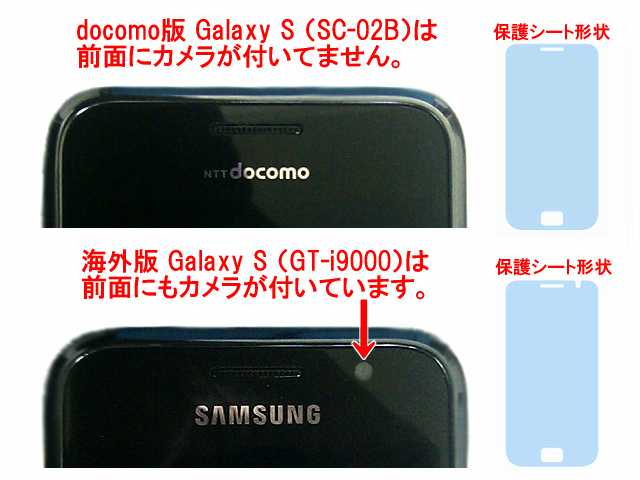 それぞれ、前面カメラのない docomo Galaxy S(SC-02B)用 と 前面カメラのある 海外版 Galaxy S(GT-i9000)用の 2種類を用意しましたので、ご注文時に、どちらか選択してください。