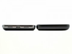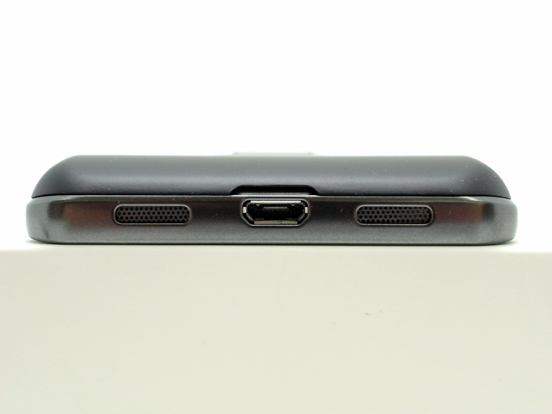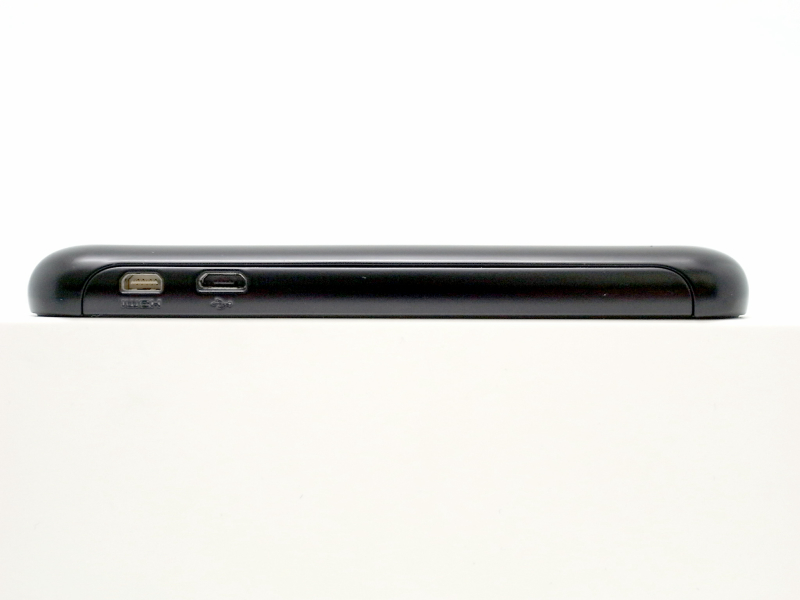 右側の上方に音量調整ボタン。左側の下方に HDMI(type D)出力端子と microUSB端子が並ぶ。専用ドックに乗せることを考えると仕方がないんですが、似た端子が並んでいるので、コネクタを挿す時にちょっと迷う。
