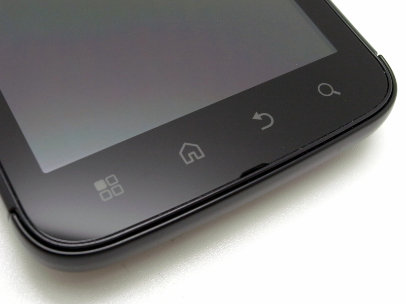 正面上には、受話口が真ん中で、受話口の左にセンサー類、右にサブカメラ。正面下には、タッチ式の Menuボタン、Homeボタン、Backボタン、Searchボタン。