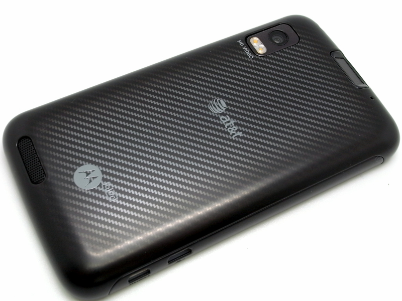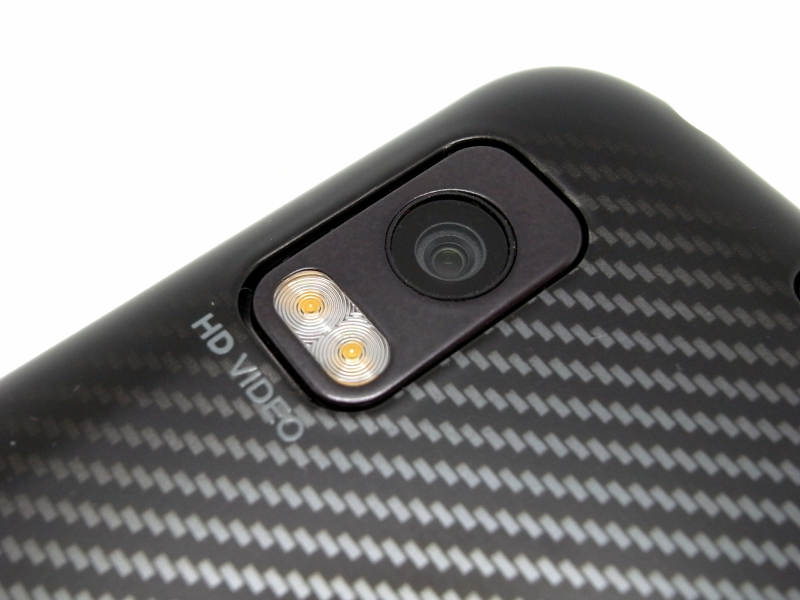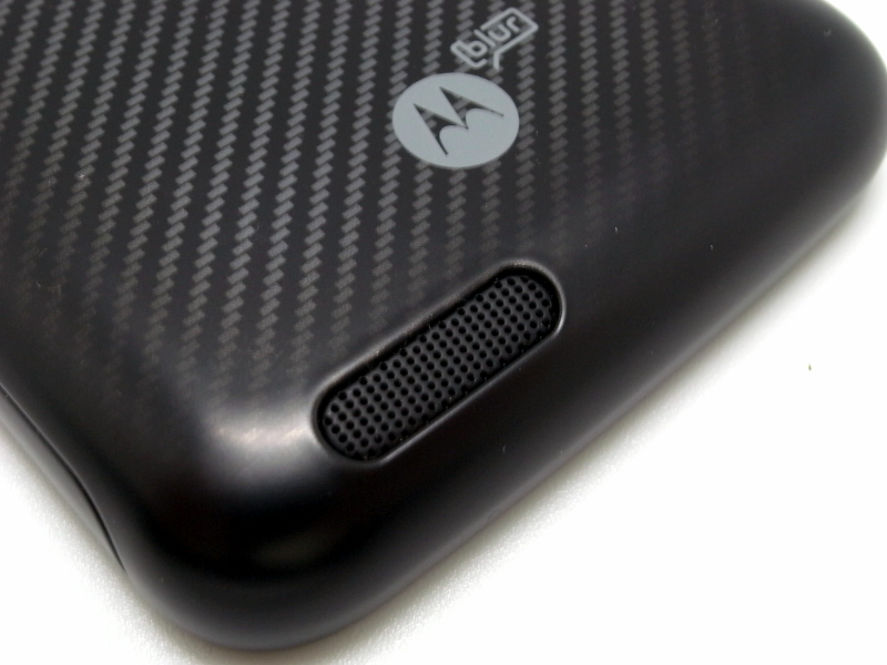 背面には、上方に5MPのメインカメラとデュアルLEDフラッシュ、下方にスピーカーがあります。カーボンパターンのデザインが施されたバックカバーは、ツルツルしていて、綺麗に磨かれたプラスチックといった感じ。