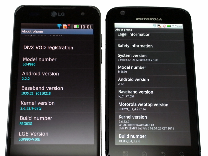 Optimus 2X(左)とATRIX 4G(右)の端末情報画面。OSは、入手時点のものですが、Optimus 2Xは、2.3へのアップグレードが表明されています。