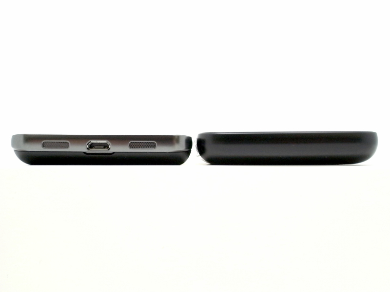 Optimus 2X(左)とATRIX 4G(右)を並べて、下から撮影。サイズは、ほぼ同じですが、個人的には、Optimus 2Xの方が持ちやすく感じました。ほんの少しですが、Optimus 2Xの方が薄く、ATRIX 4Gの方がツルツルして不安を感じたからです。この辺の微妙な違いは、個人差があると思います。自分の場合、指紋やシワが薄い?のか、手の平がツルツルしていて、持ったもののツルツル感に敏感な気がします。おかげで、指紋認証の類とは相性が悪く、ATRIX 4Gの指紋認証センサーにも嫌われがちですorz