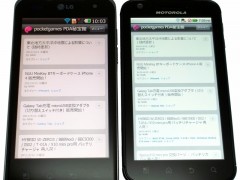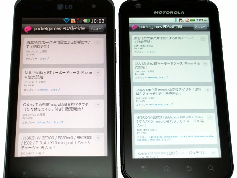 Optimus 2X(左)とATRIX 4G(右)の画面比較。画面は、どちらも4インチですが、縦横比が違い、ATRIX 4Gの方がやや縦長。当然、ATRIX 4Gの方が解像度が高い分、一覧性が高いです。見え方という点では、Optimus 2Xの方がくっきりしていて見やすいように感じます。また、明るさは、Optimus 2Xの方が変動幅が大きく、最低輝度だとOptimus 2Xの方が暗く、最高輝度ではOptimus 2Xの方が明るいです。ただし、Optimus 2Xは、明るさの調整が設定画面ではできず、ホーム画面に Power Controlのウィジットを追加して、そこで4段階の変更(最低→中間?→最高→自動調整)が可能となります。あと、並べて見て気付く程度ですが、Optimus 2Xの方がやや赤みがあります。