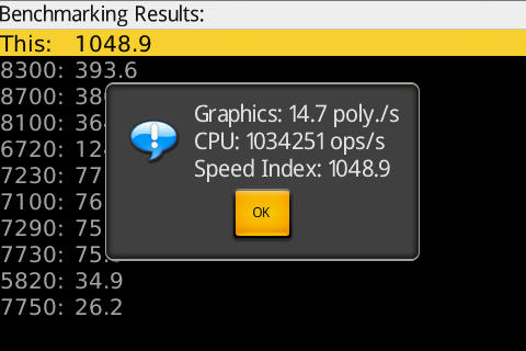 各機種の平均点?がすでに登録されていますので、自分のマシンが一体どのあたりにいるのかが良く分かります。私のBoldの場合、1000点オーバーをマークしました!(なんとなくうれしいです)